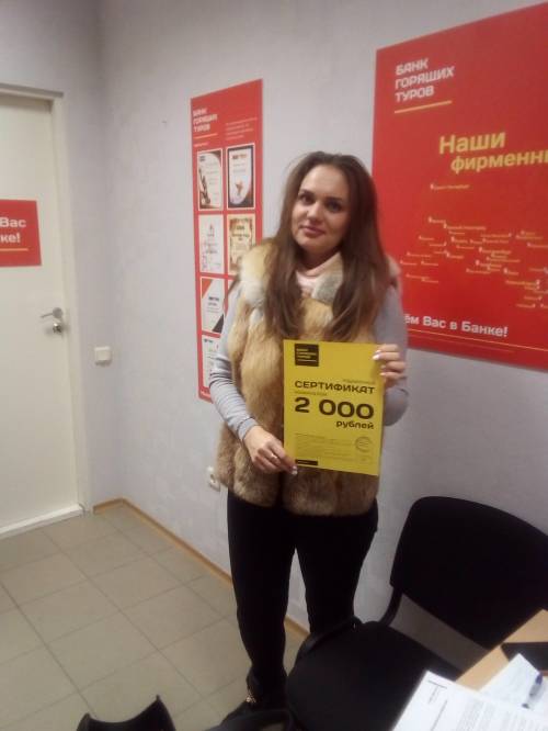 Певый раз обратилась в офис Банк гарячих турiв в Киеве, понравилась выгодная цена. В будущем ожидаю таких же выгодных цен, такого же хорошего сервиса. Благодарна за вашу работу!...